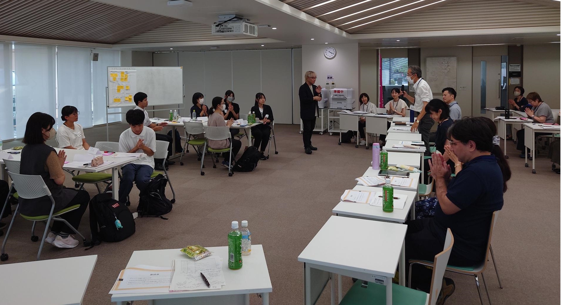 その後、「大学生が社会貢献意識を高めるには」「若者がボランティア活動に参加しやすい社会にするためには」をテーマに、各自で思ったことを付箋に記し、模造紙にまとめました。情報発信の大切さや、事前学習と事後の振り返りの必要性などが挙げられ、全員で共有しました。