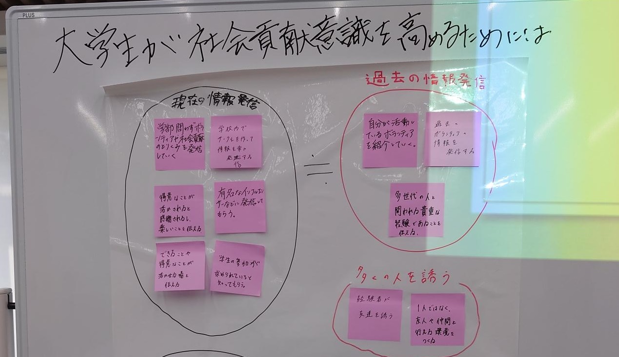 学生同士での交流から、参加したことのないボランティアの活動について知ることができました。また、どのようにしたらボランティアをする大学生が増えるのか、KJ法を使用し、まとめました。アイデアが可視化され、新たな考えを知ることができ、学びのある時間となりました。
