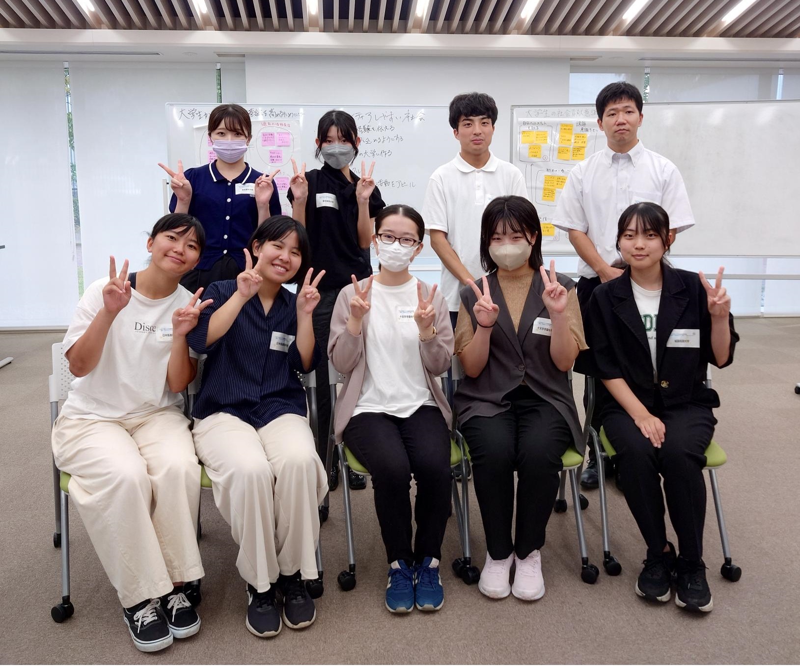 この座談会は、ボランティア活動をおこなっている学生が体験談を共有し合うことで、今後の活動に対する意欲の向上や、大学間の新たなつながりの構築を目指すことを目的としています。当日は5大学・短期大学から9名の学生が集まり、学生たちの言葉で、本音で語り合いました。