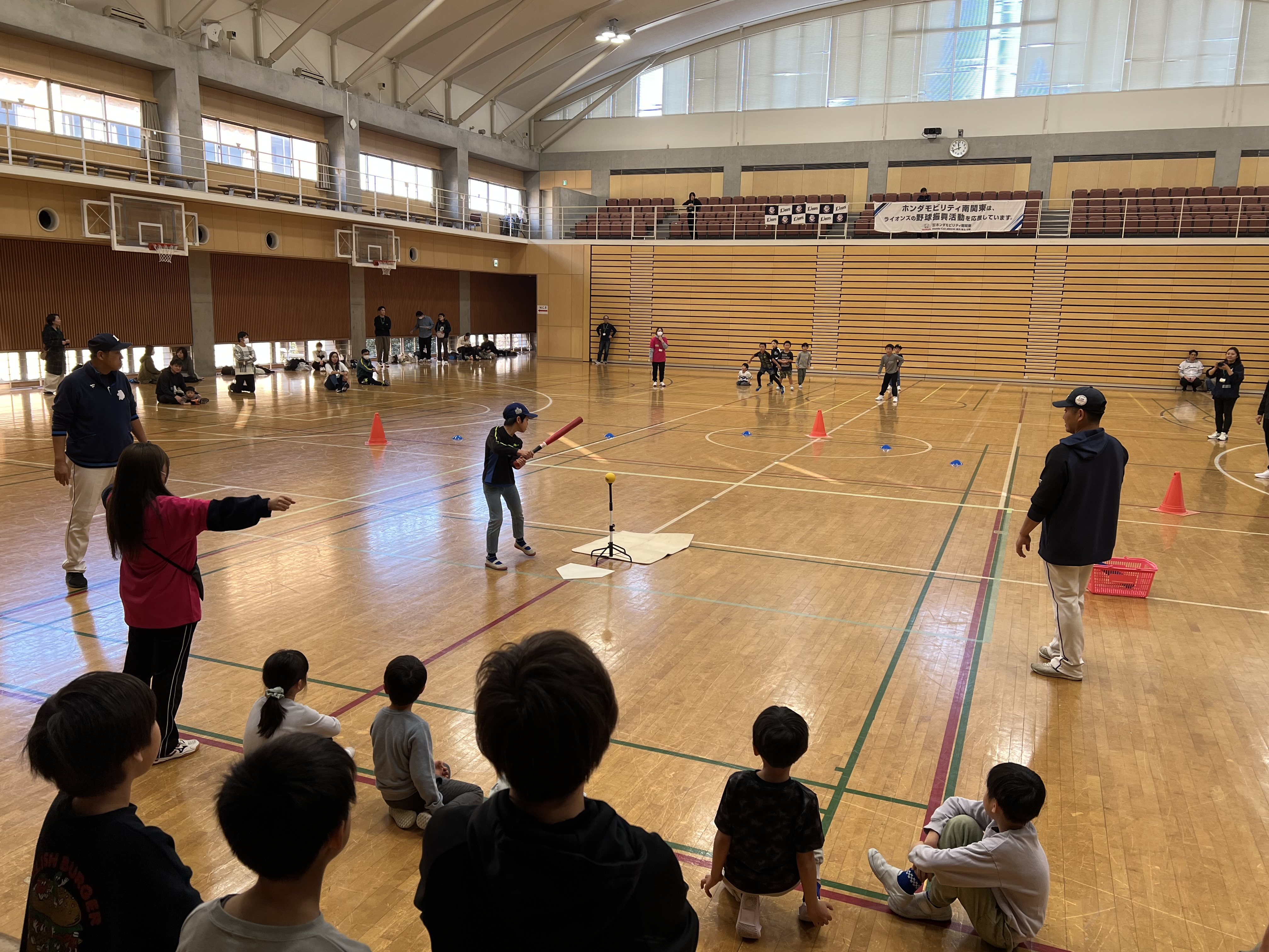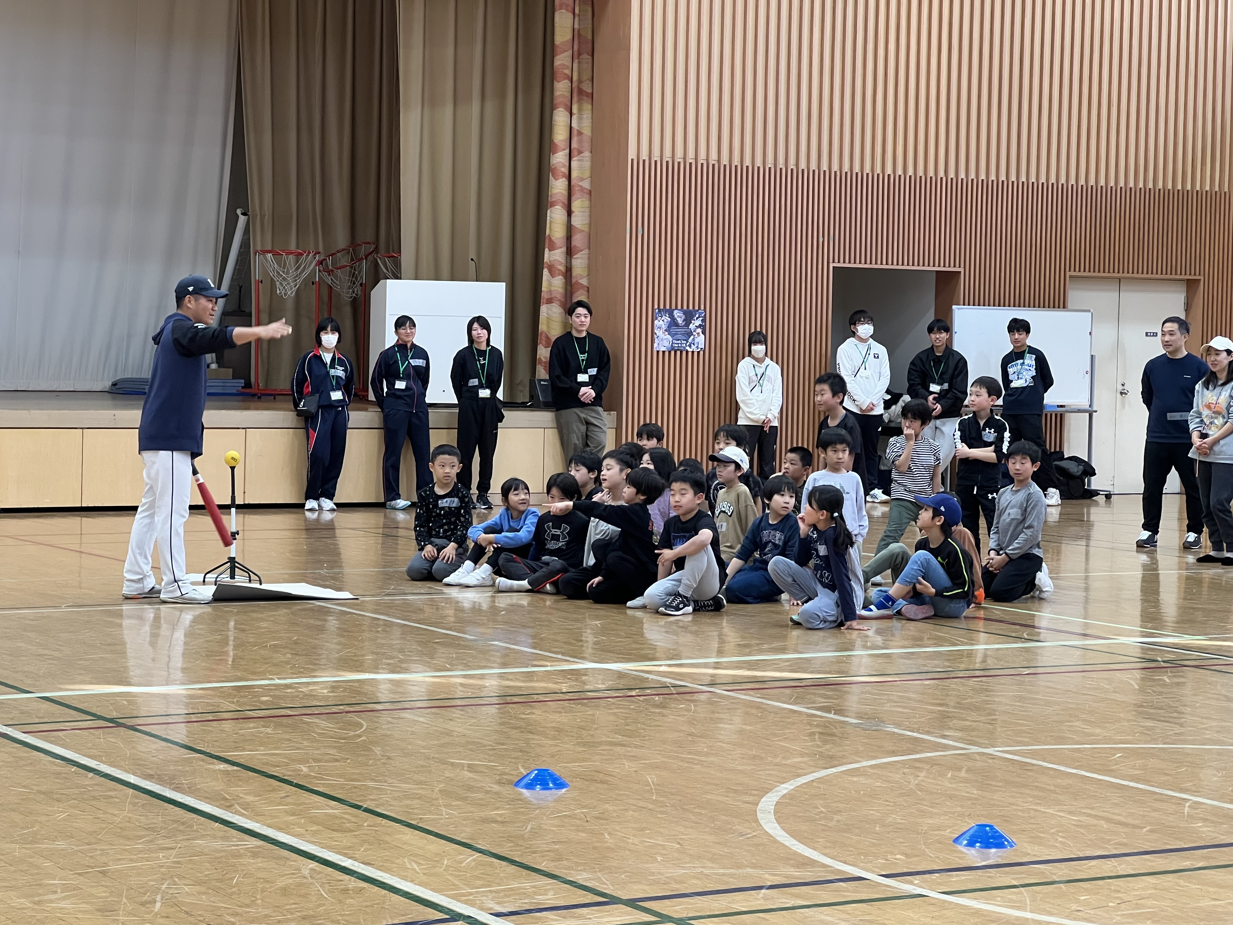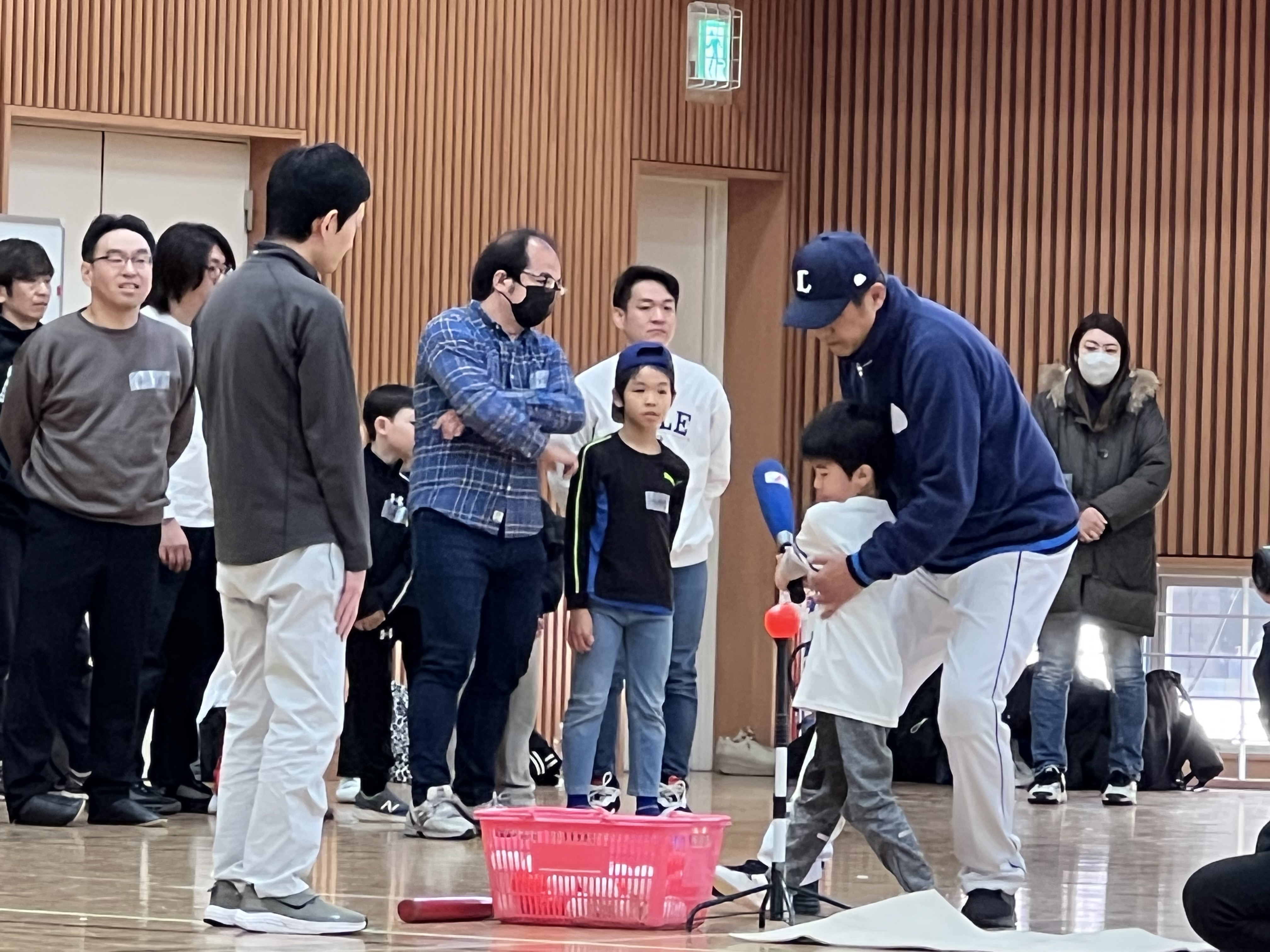 当日は、小学 1~3 年生の児童と保護者 28 組 56 名が参加。ライオンズベースボールアカデミーから、ソウルオリンピック銀メダリストでベテランの石井丈裕コーチと、明るく元気いっぱいの高橋朋己コーチの2名が指導にあたり、参加者は大きな掛け声に合わせながら、バットの振り方、ボールの投げ方などの基本動作をリズムに合わせて実践しました。最後は4チーム対戦によるミニゲームも行い、親子で野球の楽しさに触れることができました。