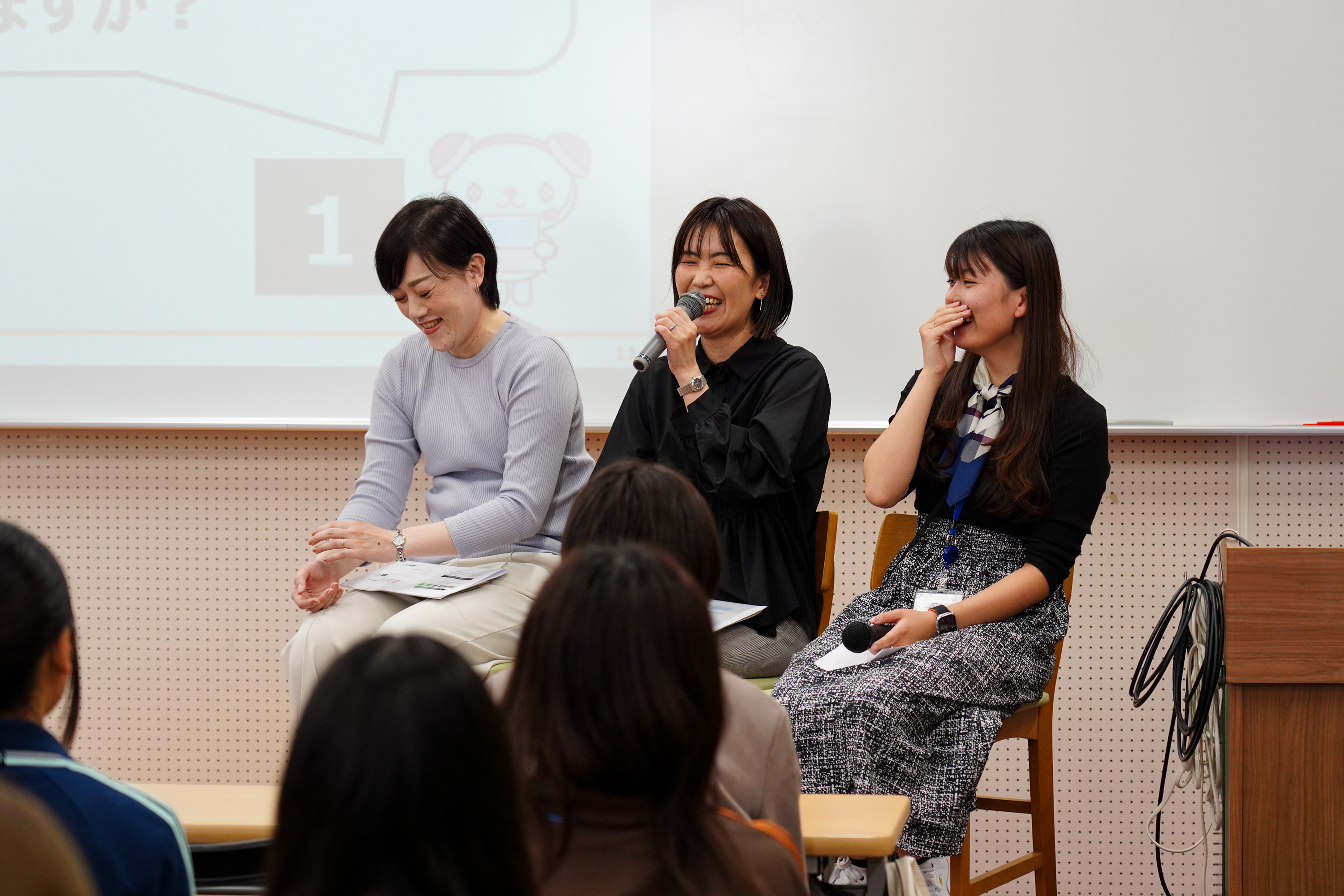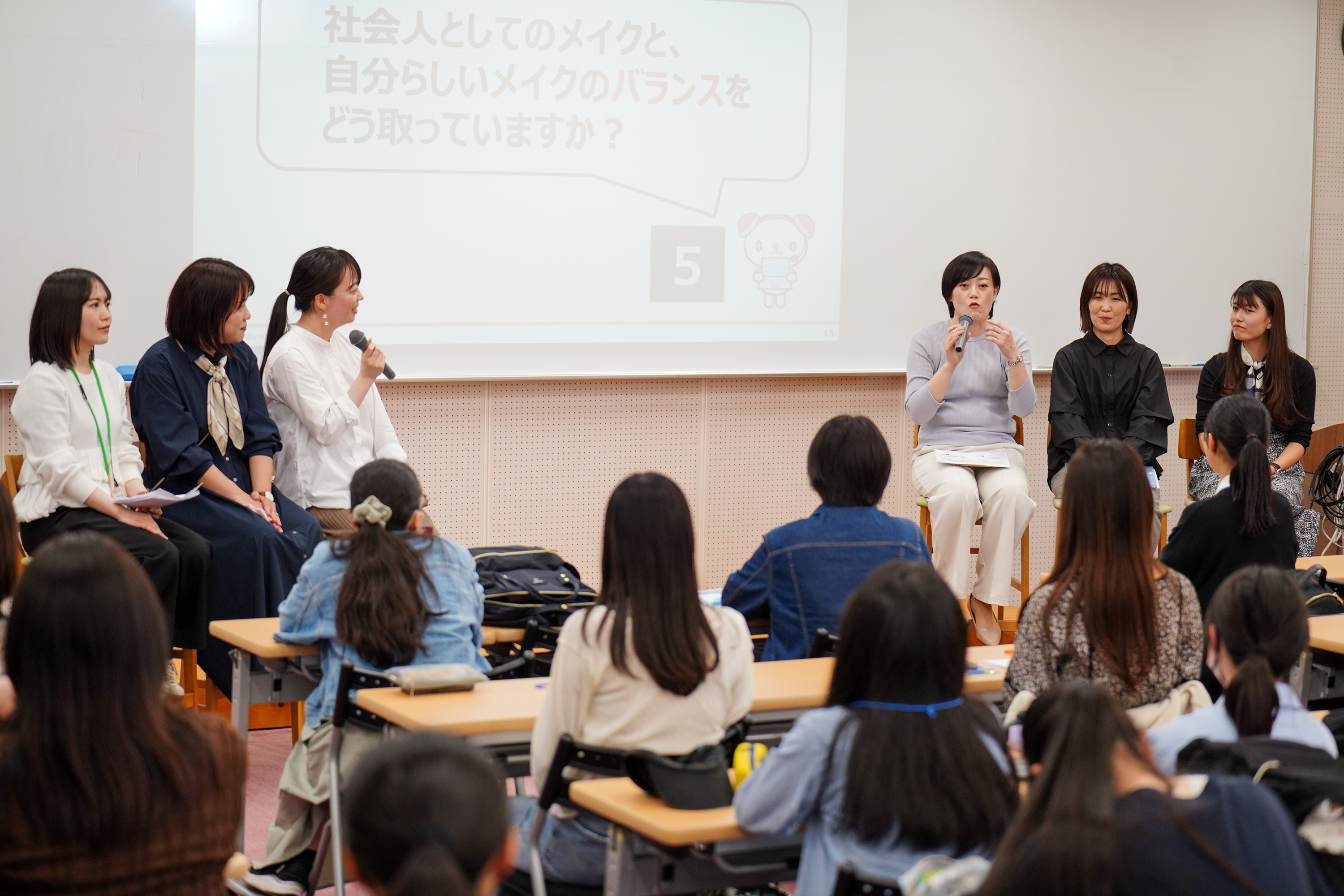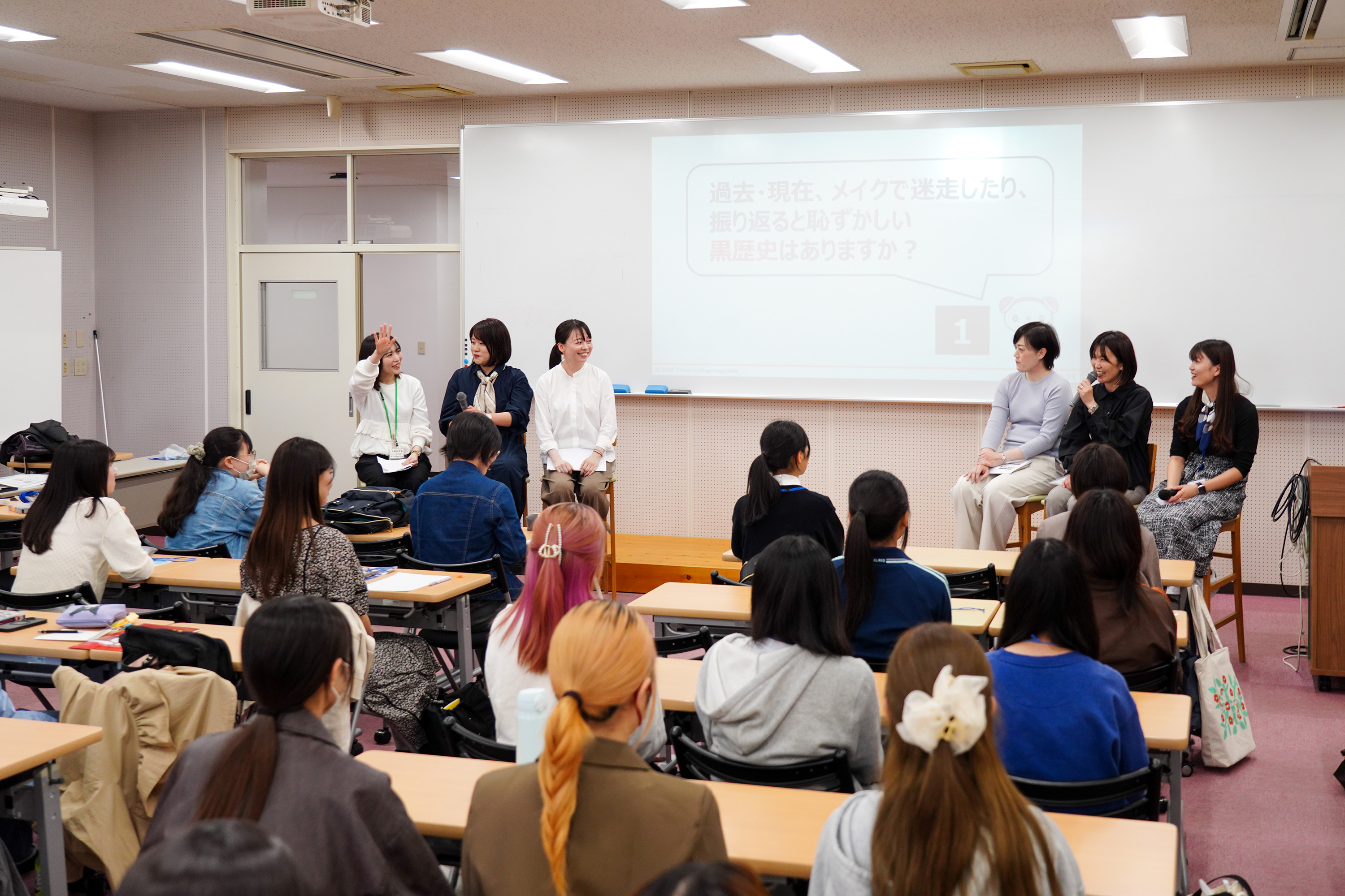 4月16日の第2回授業「ちふれ社員とのメイク座談会」では、ちふれホールディングス株式会社の社員5名と、スペシャルゲストの本学山崎萌々子先生がパネラーとして前半の「トークセッション」に登壇しました。学生たちの事前アンケートをもとに、複数のテーマを設定し、化粧にまつわる「本音」に深く切り込む、熱量の高いパネルトークが繰り広げられました。