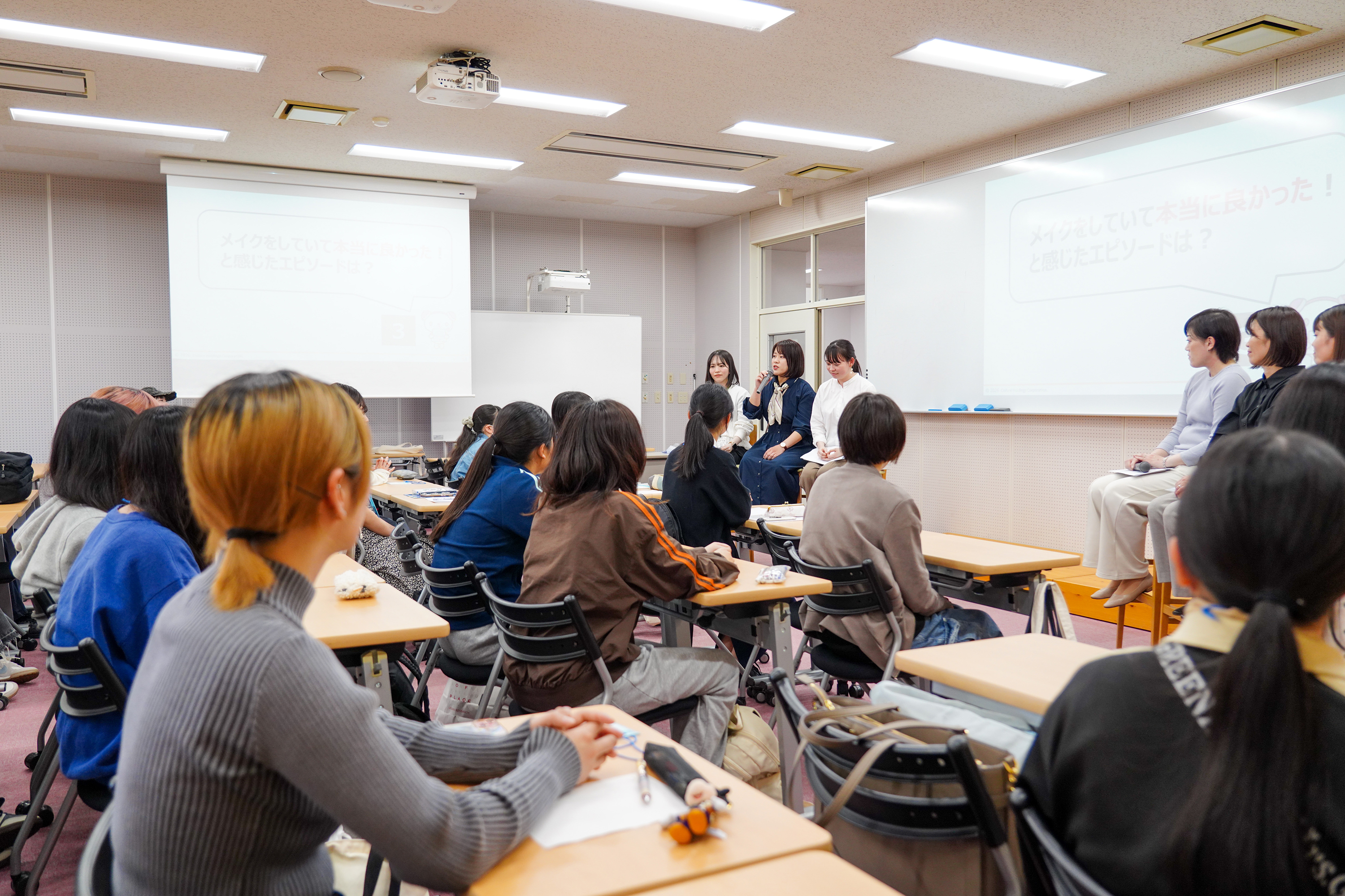 大学生時代、野球場で売り子のアルバイトをしていた時は、遠くからでも目立つ華やかなメイクでエネルギッシュさを表現していた登壇者も、現在は透明感のあるナチュラルなベースメイクに力を入れていること、また、「なりたい自分」に合わせて、化粧を「手段」として使いこなすことで、自己肯定感を高めることの有効性が語られました。