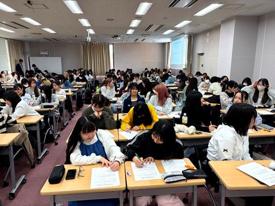 4月9日の第1回授業「ガイダンス」には150名を超える履修希望者が参加し、アンケート結果からも女子大生のメイクやスキンケアへの関心の高さがうかがえました。「私らしさとは何か」を考えたいという受講理由を挙げた学生も多かったです。