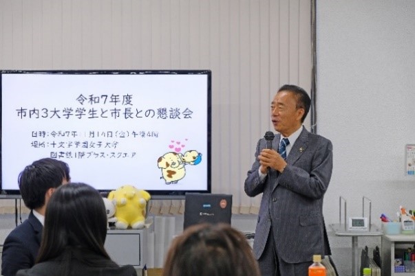この懇談会は、地域社会の発展や若者の市政参加促進を目的としており、新座市内の3大学(跡見学園女子大学、立教大学、本学)の学生が、各大学の特徴を生かした視点で地域の課題について議論しました。