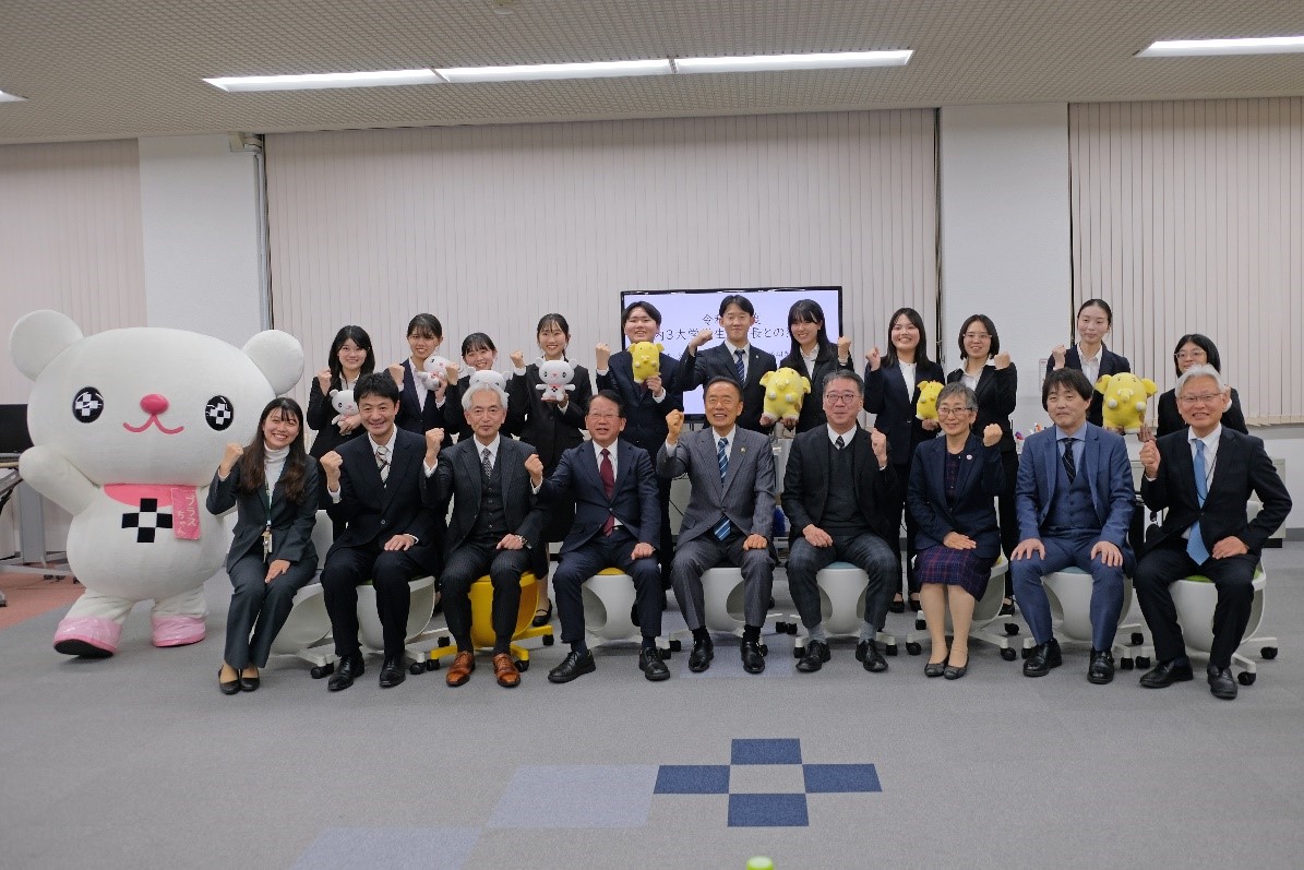 並木市長、金子教育長、3大学の学生・教職員、プラスちゃんが勢ぞろい