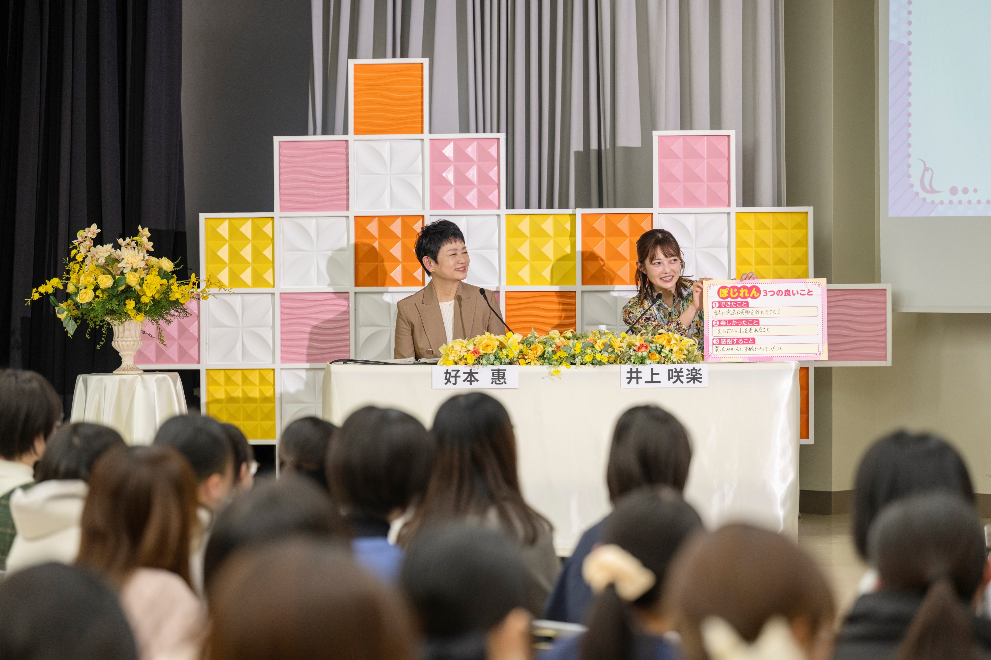 学生と同世代のタレントの井上咲楽さんをゲストに迎え、元NHKアナウンサーで本学名誉教授の好本惠先生を司会に、専門の先生方に心身の悩みの原因や対処法についての話を伺いました。