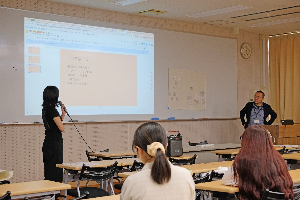 9月22日からの授業では、成田市に本社を置く平山建設株式会社の平山秀樹代表取締役社長をお迎えし、「氷山モデル」を用いながら「インサイド・アウト(内から外へ)」の考え方についてご講義いただきました。学生は、自身のキャリアに対する不安や期待を整理し、「できごと」「パターン」「メンタルモデル」を掘り下げるワークに取り組みました。その後、チームごとに「小さな一歩宣言」として発表資料を作成し、発表を行いました。自分の内面に向き合い、小さな行動変化から未来を切り開く意識を高める貴重な機会となりました。