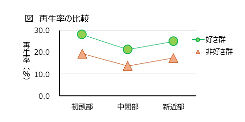 統計的に分析した結果、好きな色で書いた学生(好き群)の再生率の方が、好きではない色で書いた学生(非好き群)よりも、高くなる傾向が示されました。一方で、提示した順序の間では、統計的な違いはみられませんでした(図)。