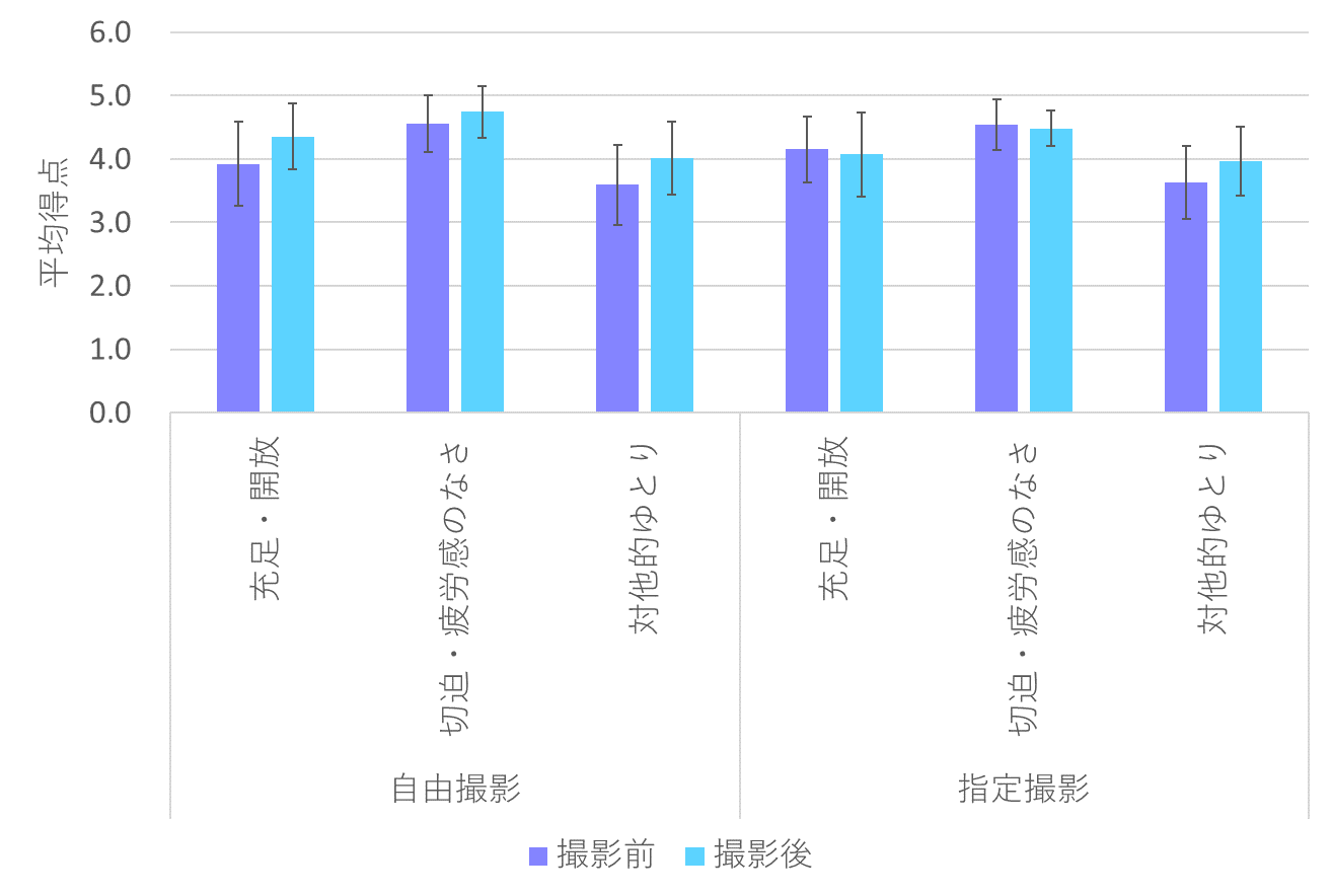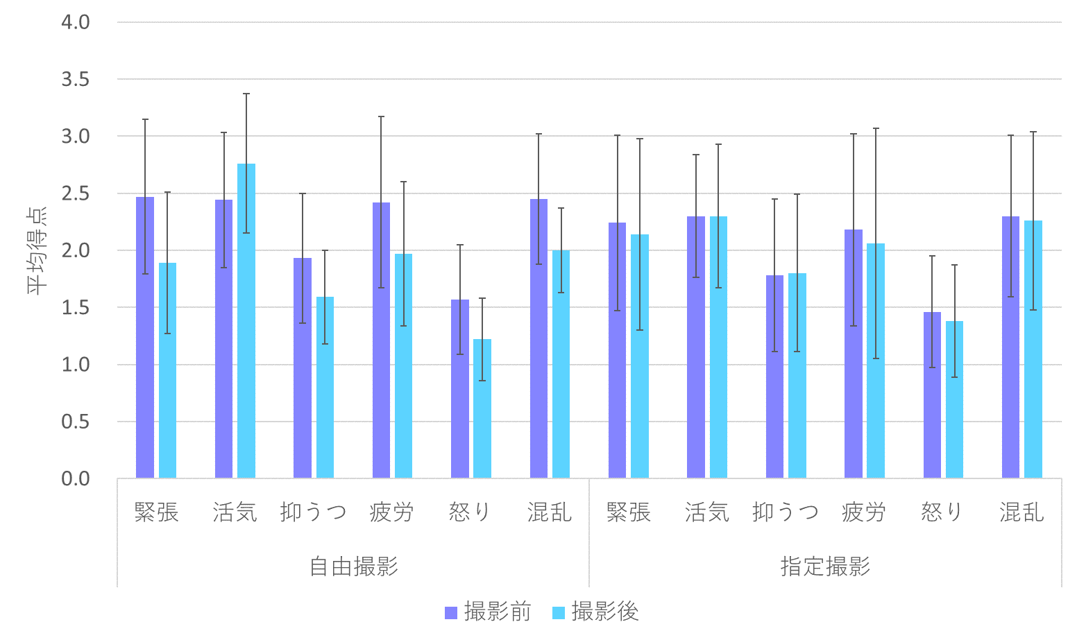 分析の結果、「自由に好きなものを撮った」グループの学生は、撮影後に緊張や疲労、怒りが減り、活気や心のゆとりが高まりました(図1・2)。一方で、決められた被写体を撮った学生にはそのような変化は見られませんでした。
