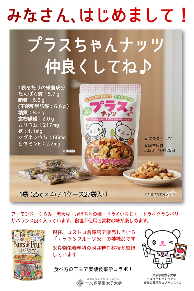 - 2025年11月 食物栄養学科 國井 大輔 特任教授が開発に携わった「プラスちゃんナッツ」を「新座フェス」で紹介しました