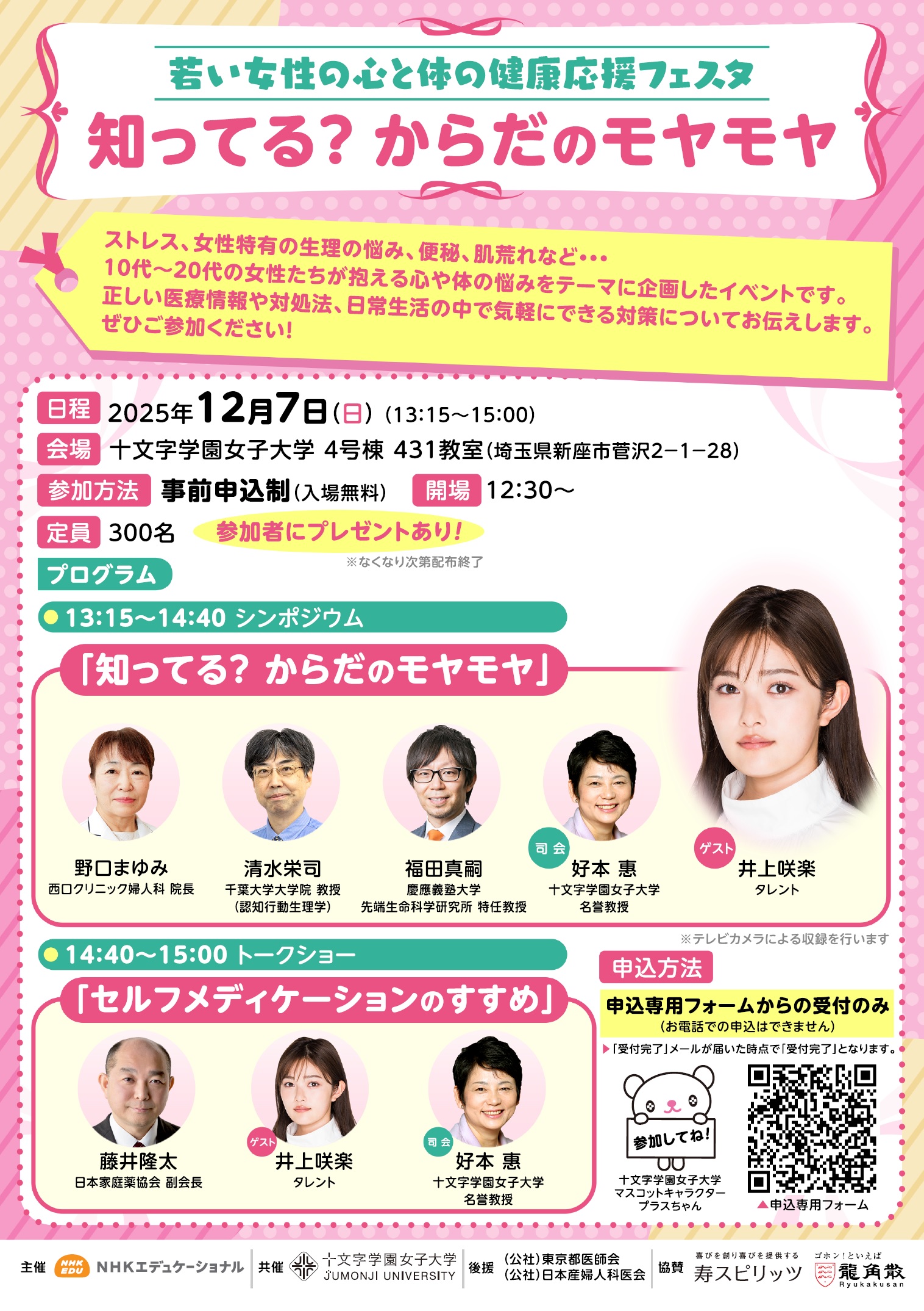 十文字学園女子大学は、2025年12月7日(日)に4号棟431教室にて「若い女性の心と体の健康応援フェスタ~知ってる?からだのモヤモヤ」を開催します。