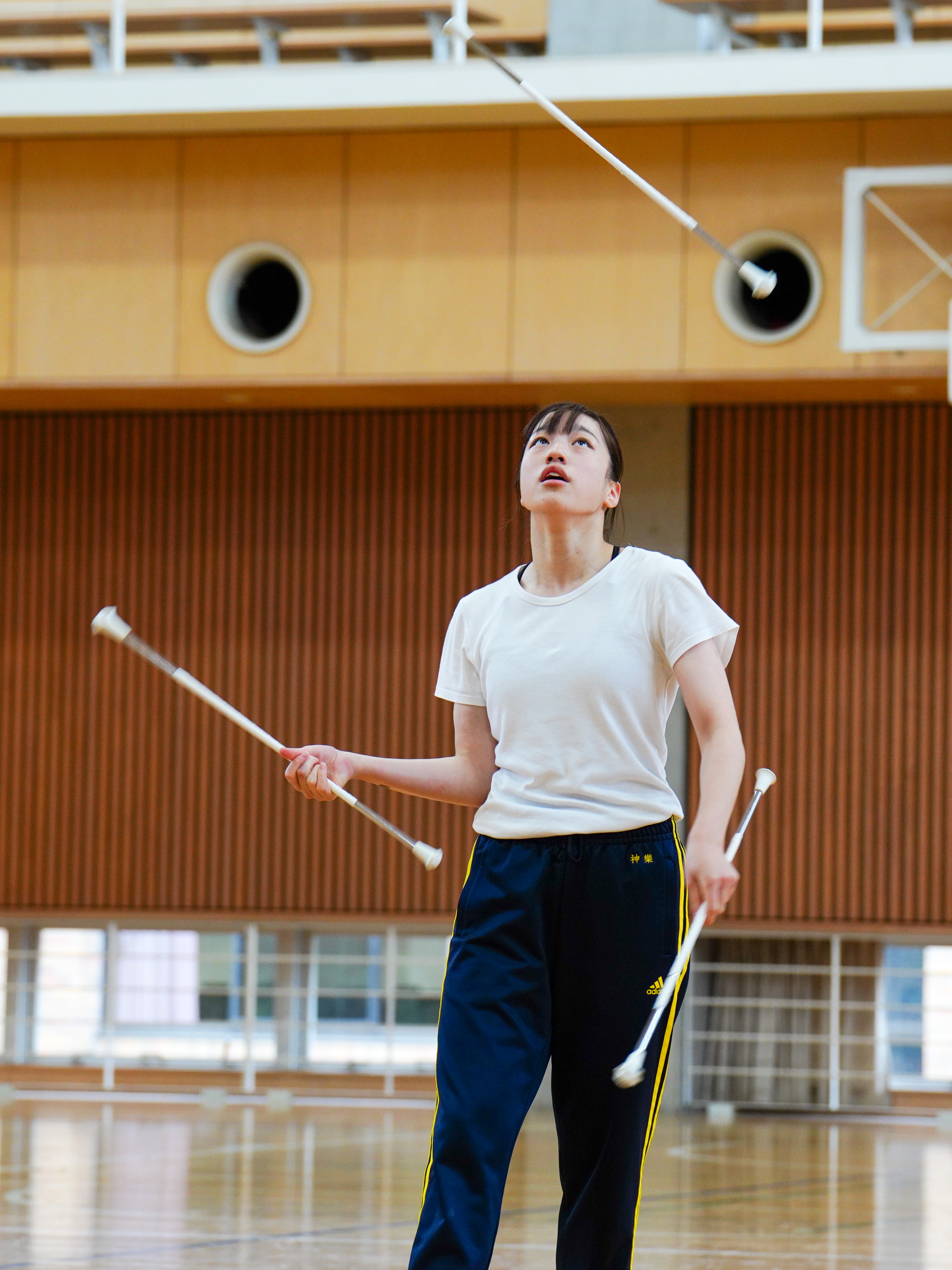 バトントワーリングは、20世紀初頭・アメリカでの音楽隊によるパレードの指揮者が起源の競技です。棒状の手具(バトン)を回転させる(トワーリング)という意味をもち、バトンの操作と身体の動きを音楽に合わせて組み合わせる、芸術性の高いスポーツとして、発展を重ねています。