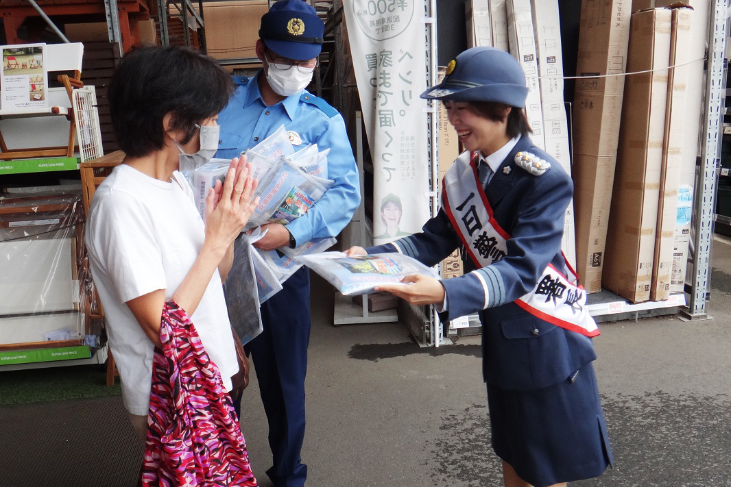 その後、氏家さんの「乗車!エンジン始動!出発!」という掛け声とともに、パトカーと白バイが市内の街頭啓発に出発、式典後は、買い物に訪れた人たちに交通安全を呼び掛けるチラシや啓発グッズなどを手渡ししながら街頭活動を実施し、交通事故防止を訴えました。