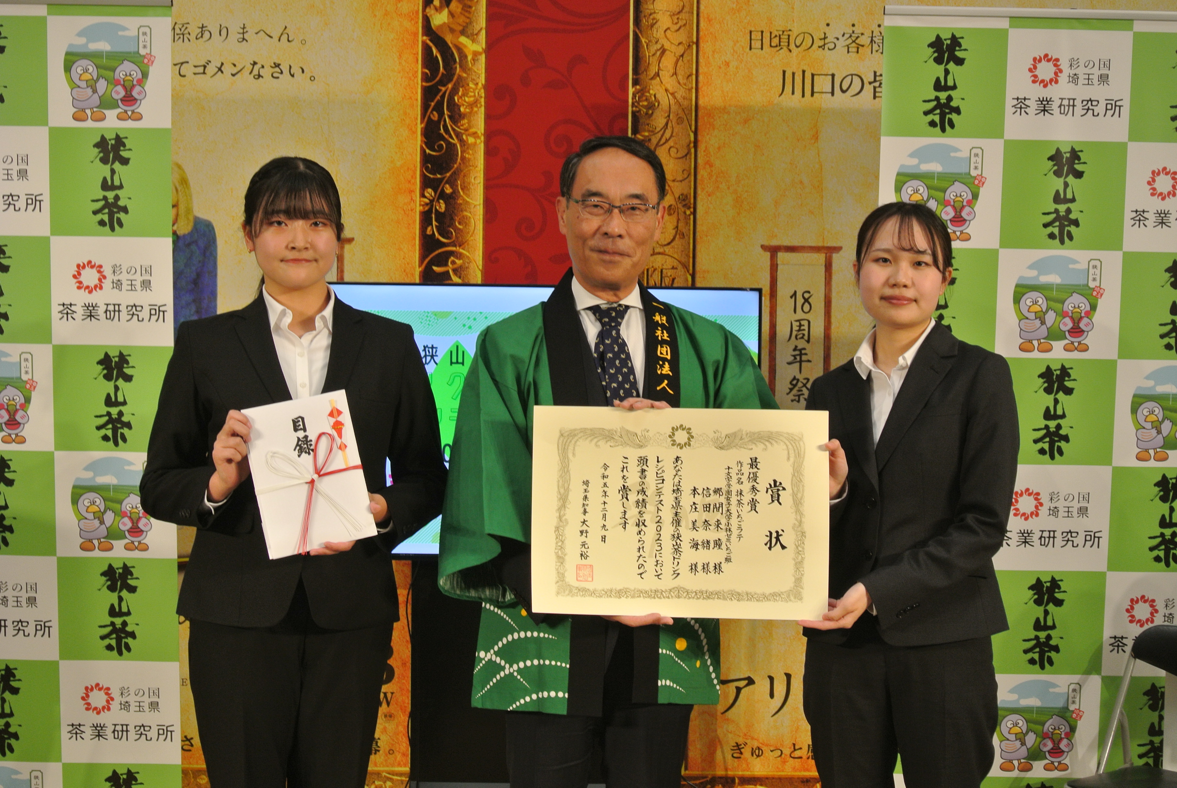 食品開発学科学生3名が埼玉県主催「狭山茶ドリンクレシピコンテスト2023」で最優秀賞を受賞、12月9日(土)に行われた表彰式で大野元裕 埼玉県知事より表彰状を授与されました。