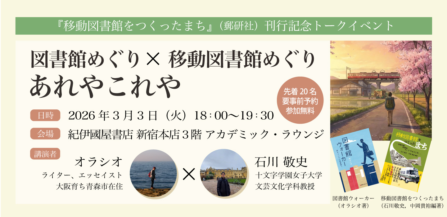 文芸文化学科 石川 敬史教授、(株)郵研社、日外アソシエーツ(株)、紀伊國屋書店新宿本店は、2026年3月3日(火)、図書館と地域の歴史をテーマにしたトークイベント「図書館めぐり×移動図書館めぐり あれやこれや」を開催いたします。