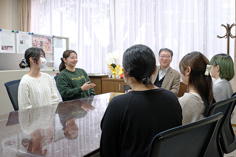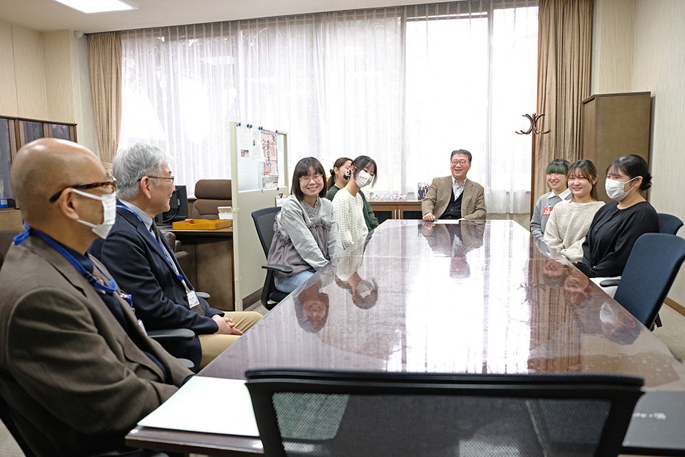 2025年12月3日(水)「学長と学生の交流会」では、11月14日(金)に本学で実施された、『令和7年度市内3大学学生と市長との懇談会』参加した、社会情報デザイン学科の学生4名が学長室を訪問しました。