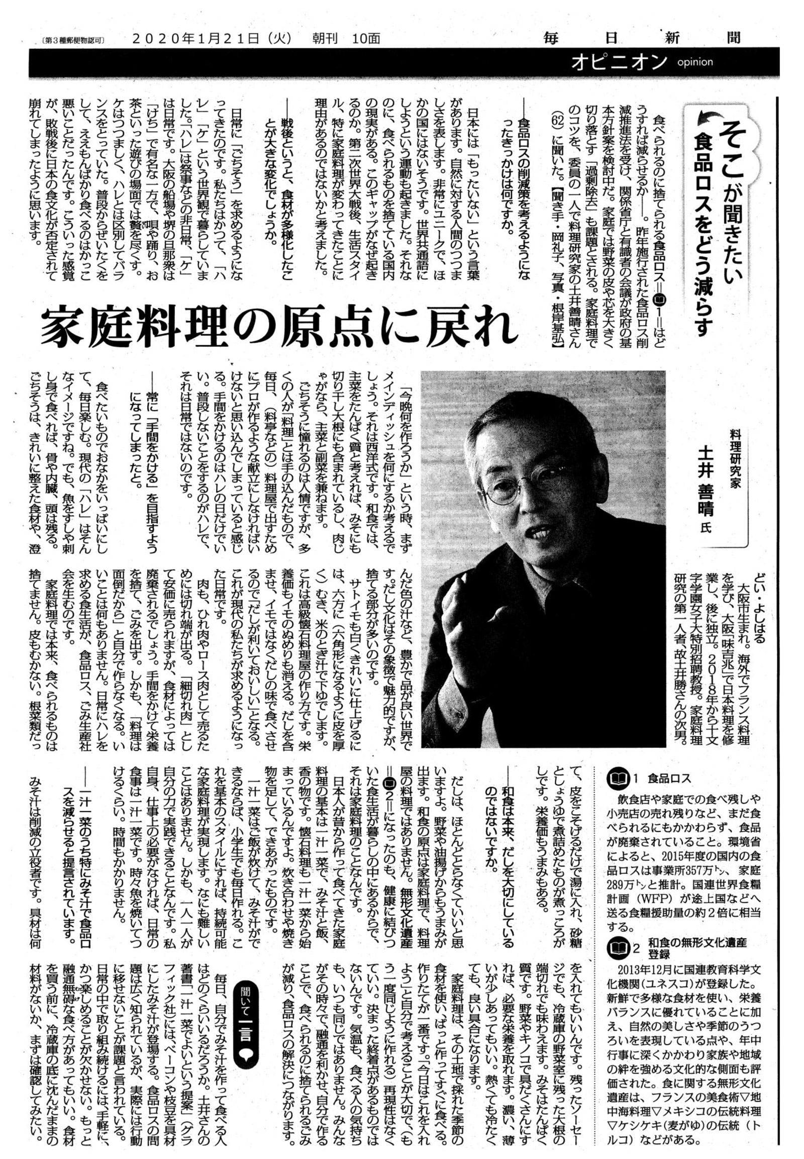 土井善晴氏の父である土井勝氏は、「おふくろの味」という言葉を広めた家庭料理研究の第一人者。