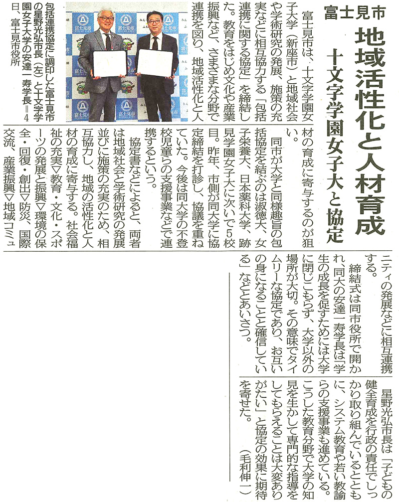 本学と富士見市が締結した包括連携協定について、2026年3月10日付の「埼玉新聞」に記事が掲載されました。
