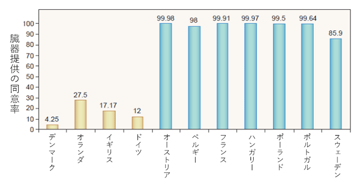 次の図は、さまざまな国の臓器提供の同意率を示したものです。