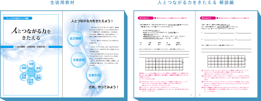 このワークブックでは、まず、自分がどんなことを知っていて、自分がどんなことを考えているのかを知ります。 そして、いま自分が言っていることと、おこなっていることをとらえて、「伝えたいこと」を明らかにし、その表現の仕方を身に付けます。 そこで、相手の考えをよく整理して理解し、自分の考えを正確に伝え、「人とつながる力」をきたえます。