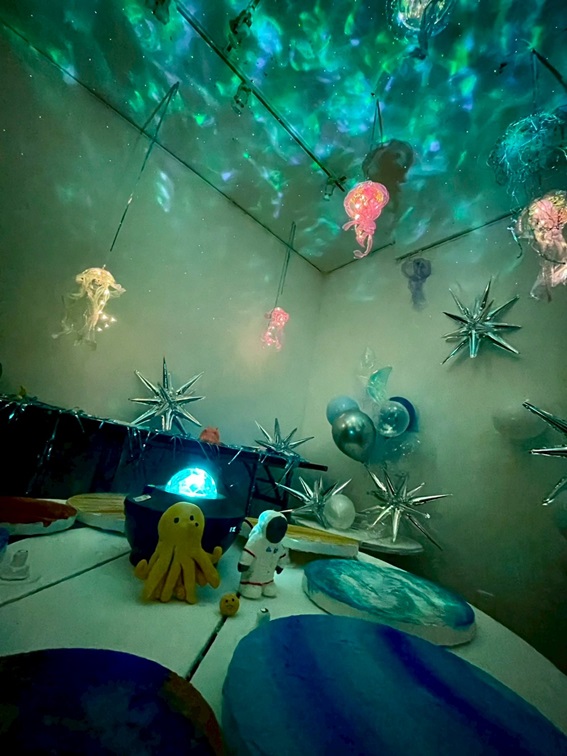 日頃はグラフィックデザインを中心に学ぶ学生たちが、表現領域を広げる実践の場として、空間全体を用いたインスタレーションアートに挑戦。設定したテーマをもとに、視覚・構成・体験を意識した空間表現として作品を制作しました。