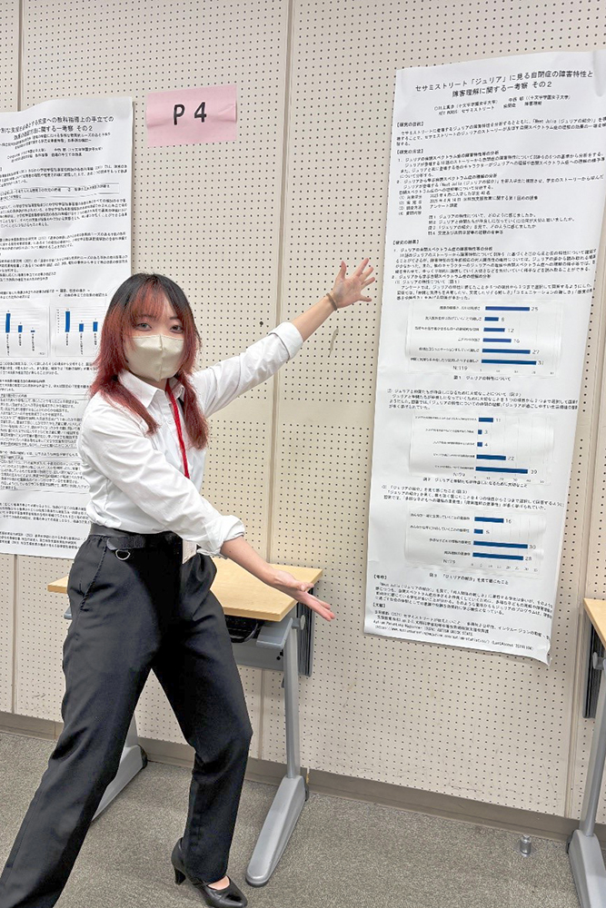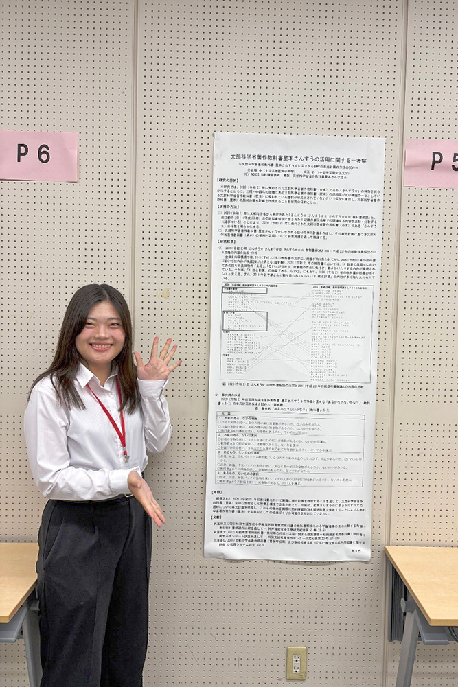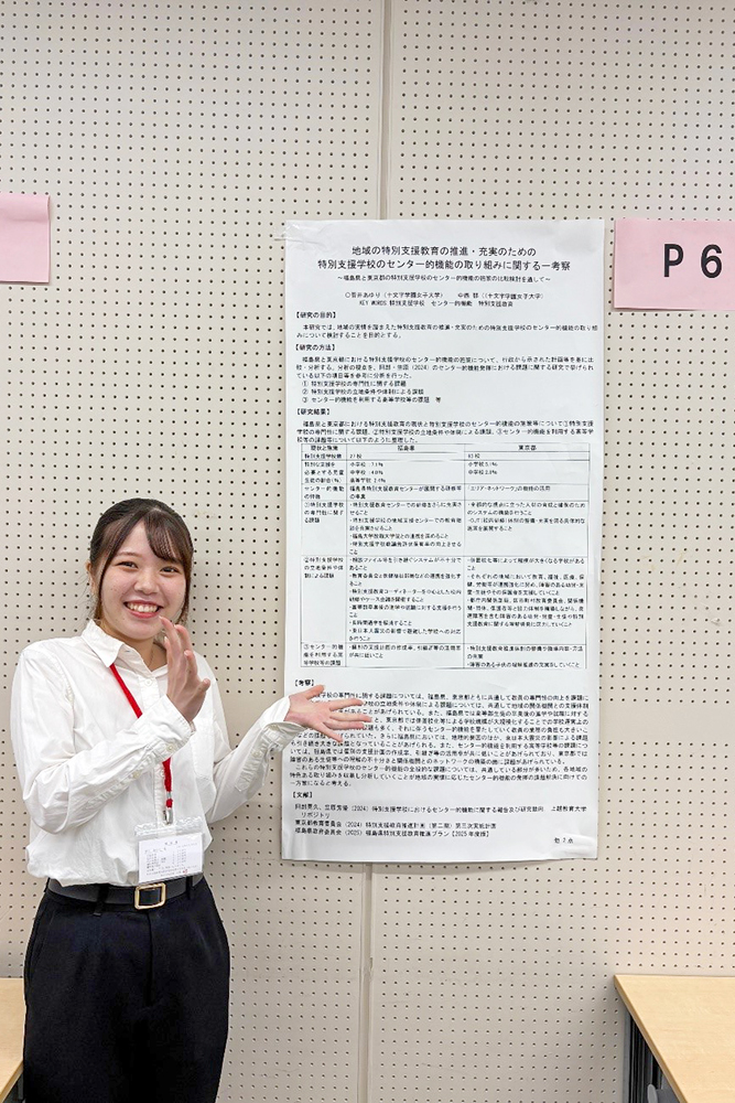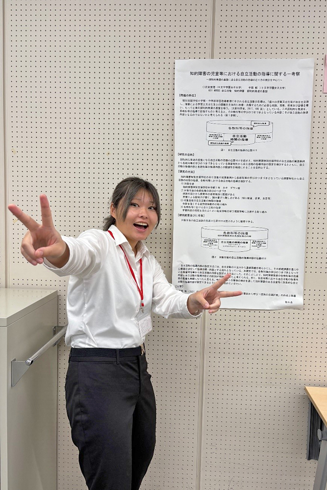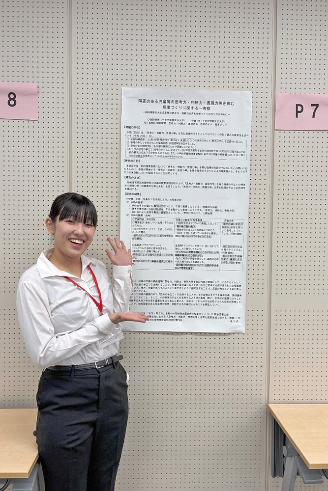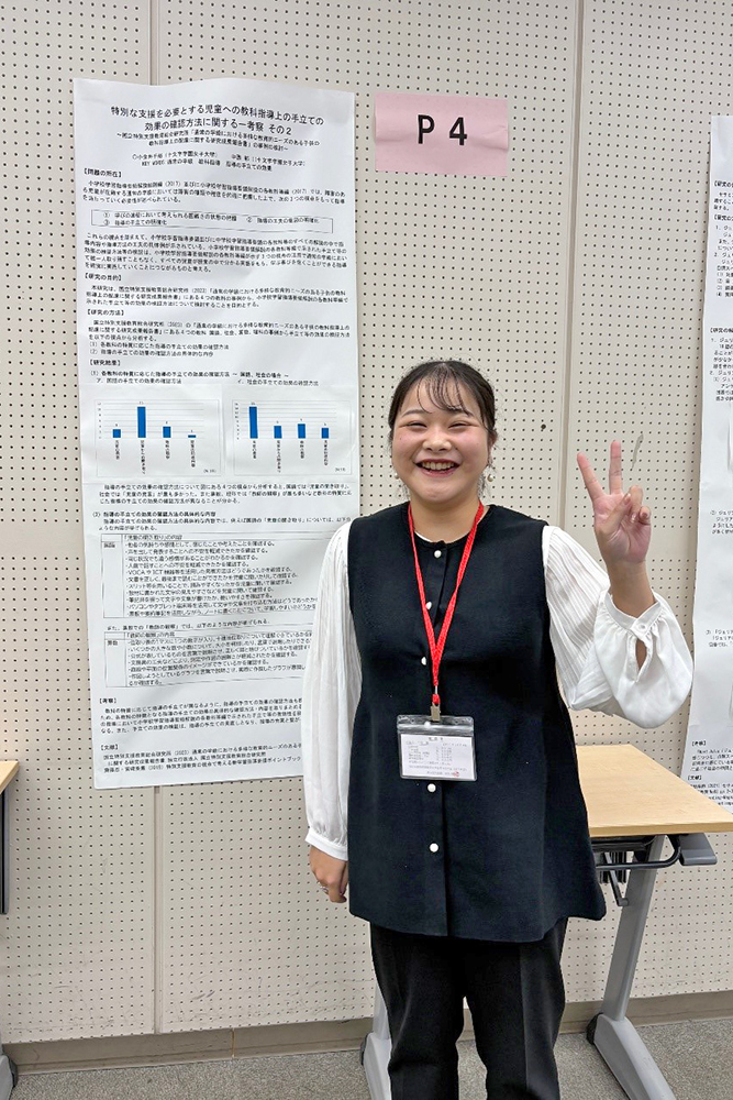 ポスター発表でのご指導を今後の研究に活かして、特別支援学校、小学校の教師になって、研究を子ども達の指導に活用していけるようにしていきます。