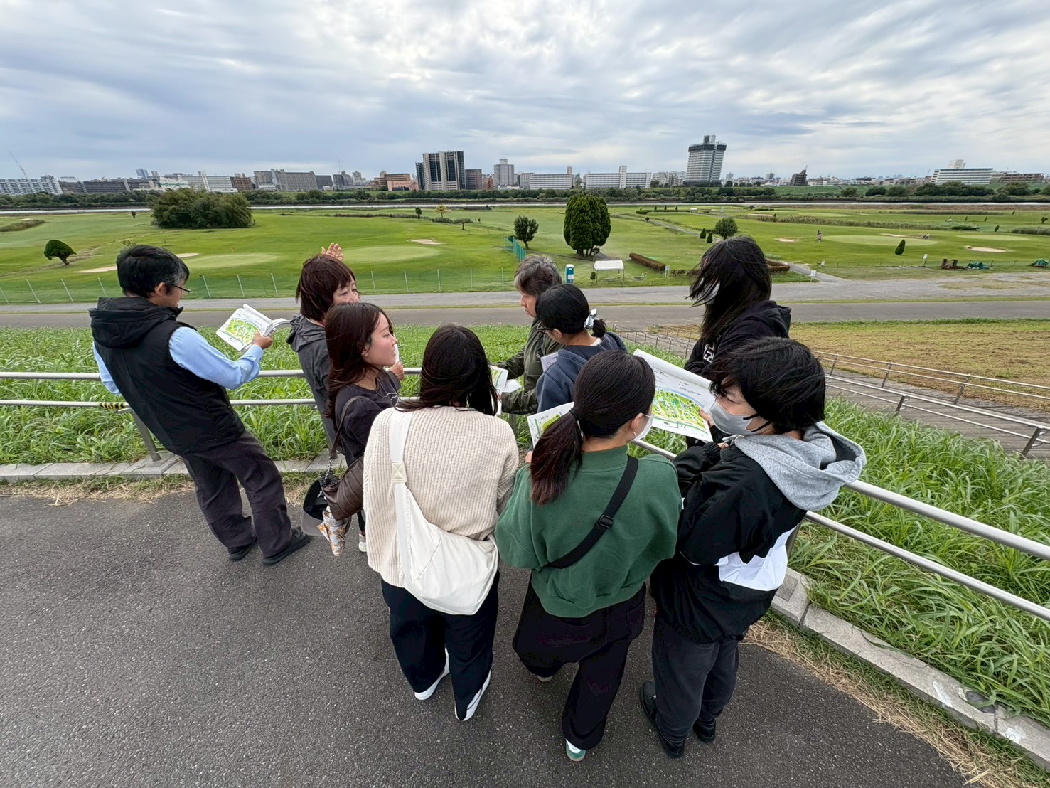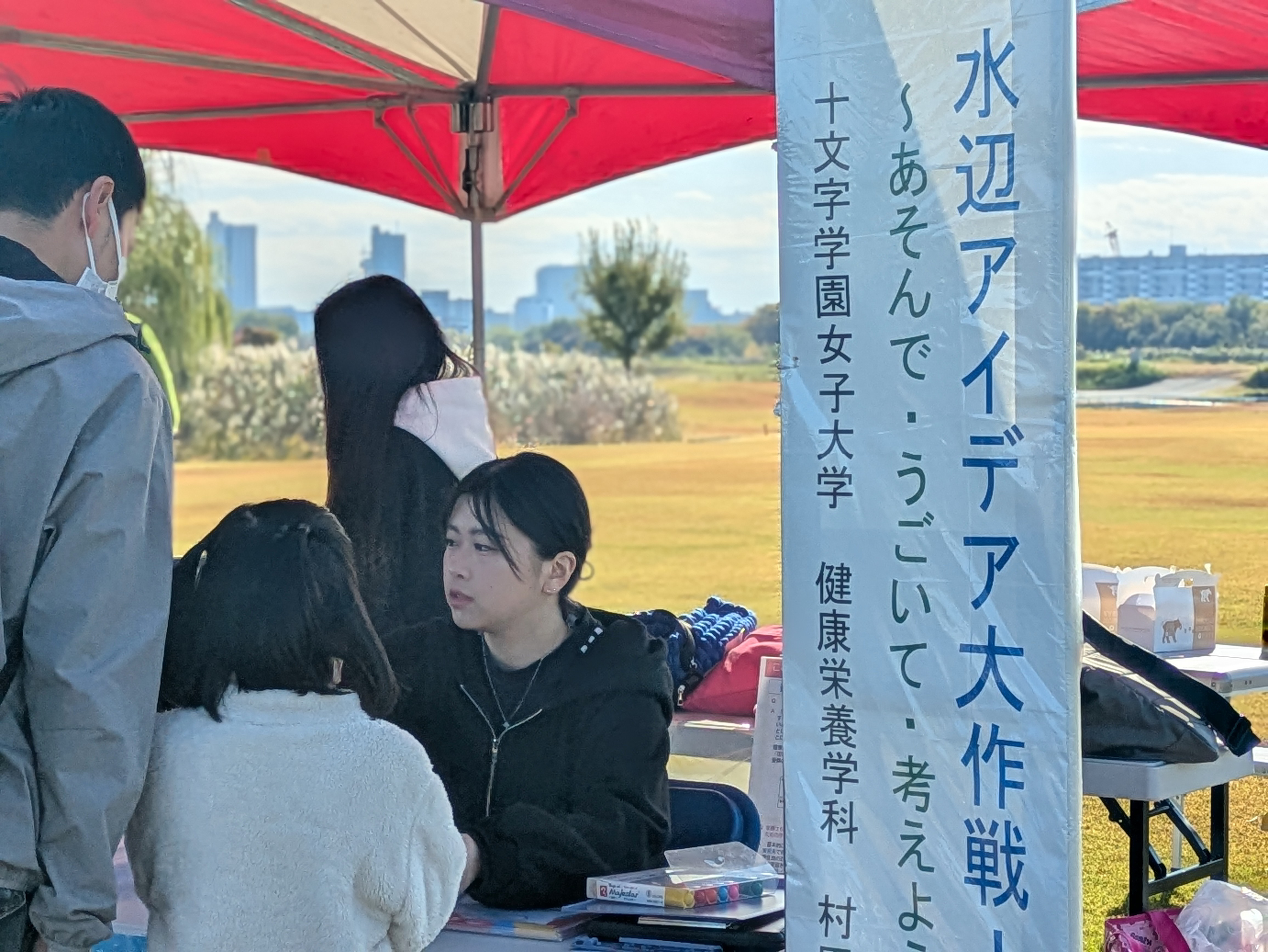 村田ゼミではここ数年、川口市荒川河川敷の有効利用を検討している「ミズベリング勉強会」の活動に参加しています。今年度は「荒川ふれあいまつり2025」のイベント会場において、手軽に楽しくできる体力測定とイベント会場付近の水辺でどのような過ごし方をしたいかのアンケートのブース「水辺アイデア大作戦!~あそんで・うごいて・考えよう~」を建築技術研究所の方々と合同で担当しました。