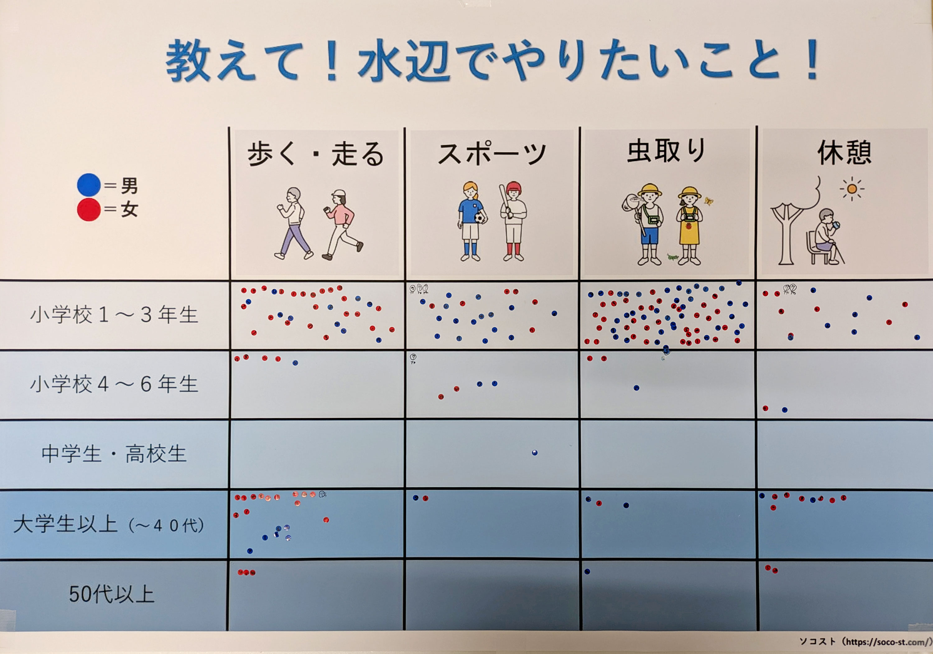 皆さまのご協力により、今回のイベント会場付近の荒川河川敷10地点を例にどのような過ごし方をしたいかについて幅広い年代の多くの方々から意見を集めることができました。今後は、ミズベリング勉強会の活動に反映していきたいと思います。