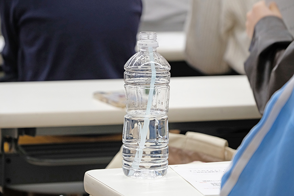身体を動かしながらの発声練習が行われ、音楽活動における身体感覚の重要性を体験的に学びました。また、ペットボトル楽器体験では、息を吸うタイミングを合わせて演奏することで、全体の音を無理なくそろえる活動を行いました。この体験を通して、特別支援教育における分かりやすい指導方法や、参加しやすい音楽活動の工夫について理解を深めました。