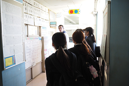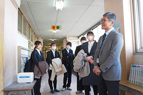 校長先生のご案内の下、校舎内の施設や学習環境について説明を受けながら、学校全体の様子を把握することができました。その後は学生が自由に校内を見学し、授業の様子や子どもたちの学校生活を間近で観察しました。