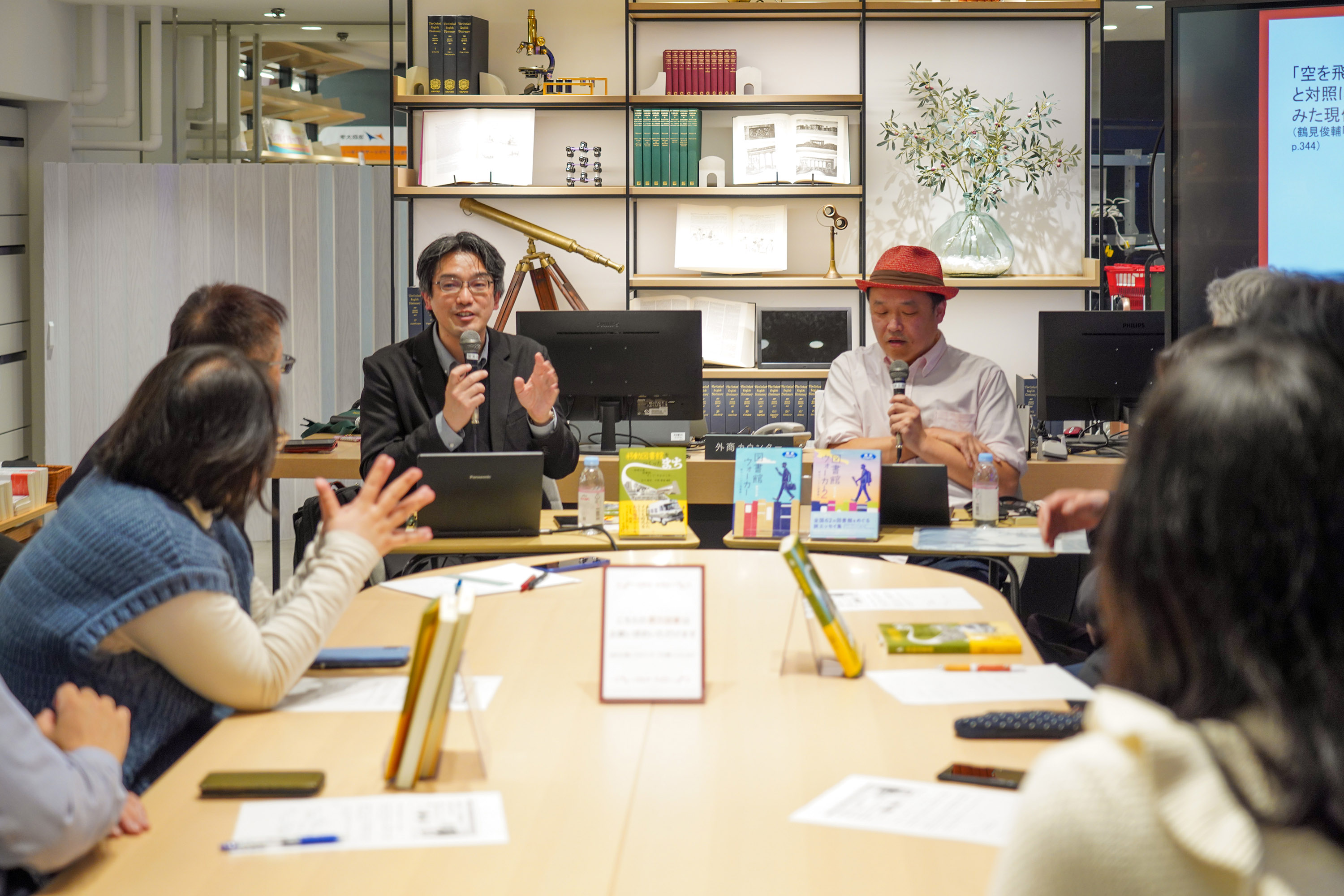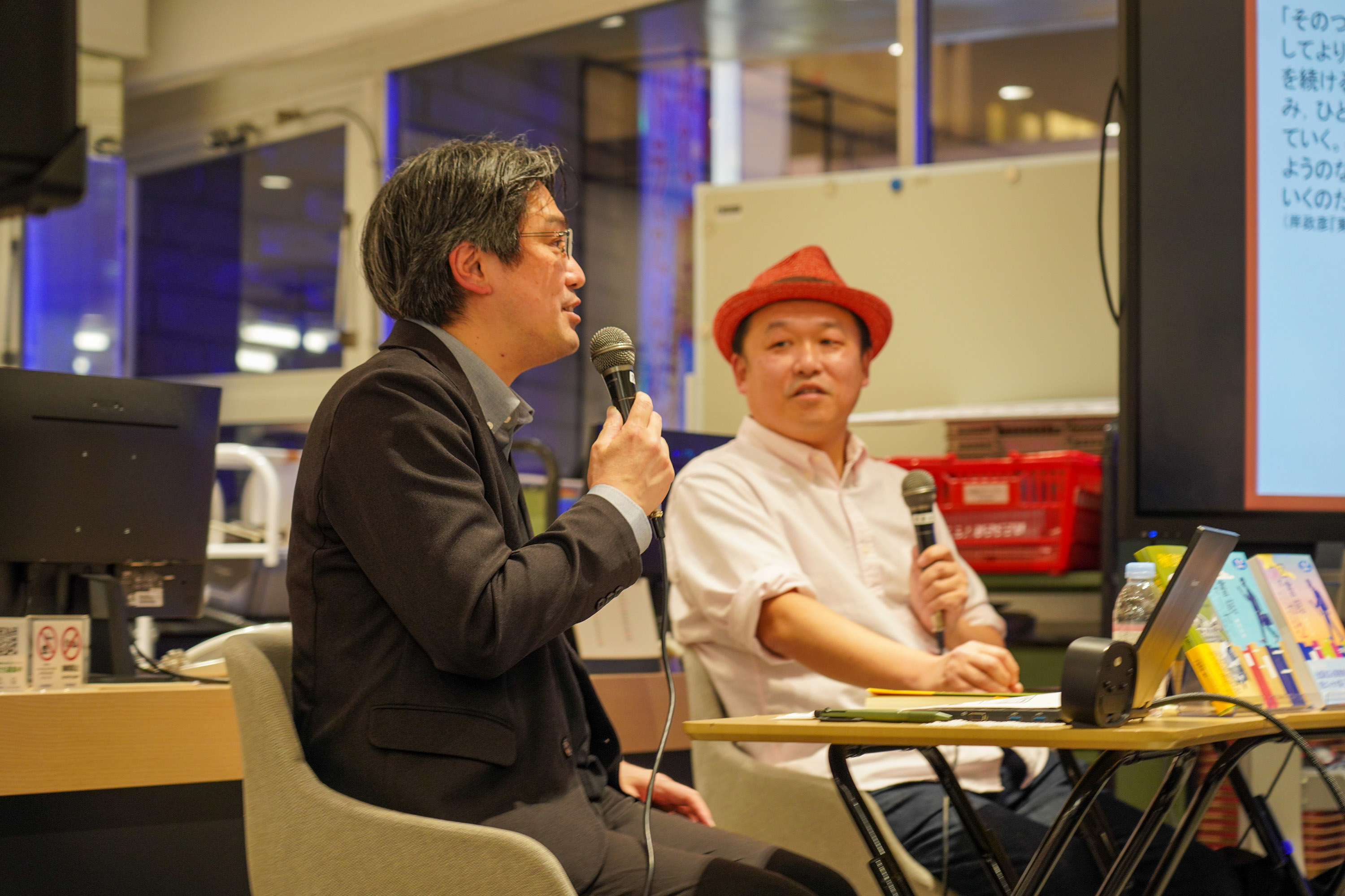 トークでは、それぞれの著書の紹介を交えながら、独自の視点による図書館・移動図書館のめぐり方、図書館が内包する地域の歴史や文化の深み、といったテーマについて、「あれやこれや」と自由で熱のこもった議論が交わされました。