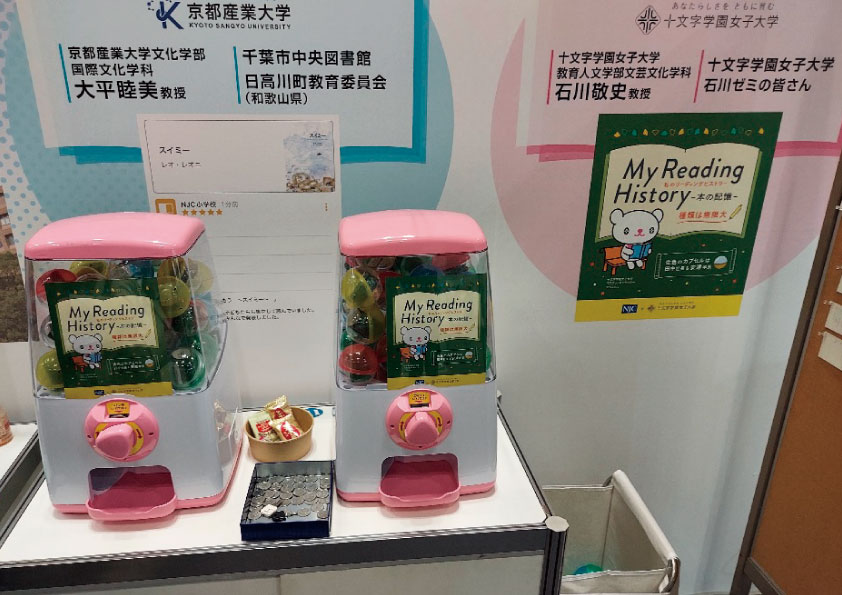 今回の共同企画では、「本の記憶」をテーマに、ひとりひとりの人生のなかで出会った本にスポットを充てました。本との出会いには、個人の喜怒哀楽様々な感情と、そしてカラフルで個性豊かな生き方が詰まっています。学生たちは、そんな「リーディングヒストリー」を手に取り、感じてもらえるよう「「Reading History」ガチャ」を企画しました。ブース発表では、企画の立案から制作までの過程を、学生がわかりやすく説明。実施するにあたり、工夫した点や大変だった点などを学生自身の言葉で、参加者に伝えました。また、「「Reading History」ガチャ」は、日本事務器株式会社のブースに設置し、来場者に実際に回してもらいました。ブースには、自身の「リーディングヒストリー」を記入できる場も設け、記入したものを展示し、共有しました。学生たちの声かけに、多くの来場者が足を止めて、説明に耳を傾ける姿が見られました。