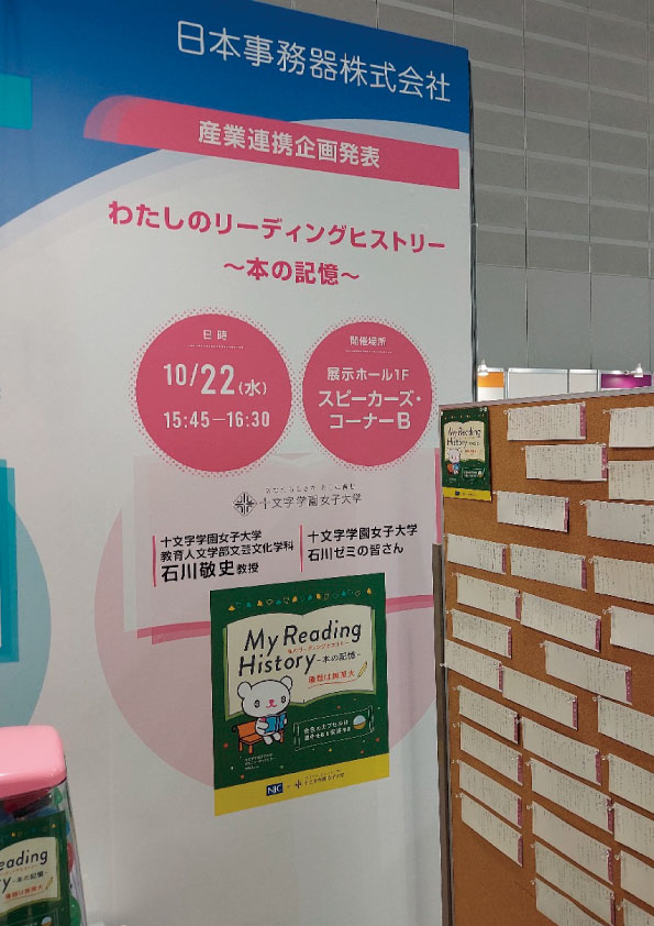 2025年10月22日(水)、パシフィコ横浜で開催された「図書館総合展2025」において、十文字学園女子大学 文芸文化学科 石川ゼミの学生たちが、トリプル合同庁舎ブースにて、日本事務器株式会社との共同企画「わたしのリーディングヒストリー〜本の記憶〜」のブース発表を行いました。